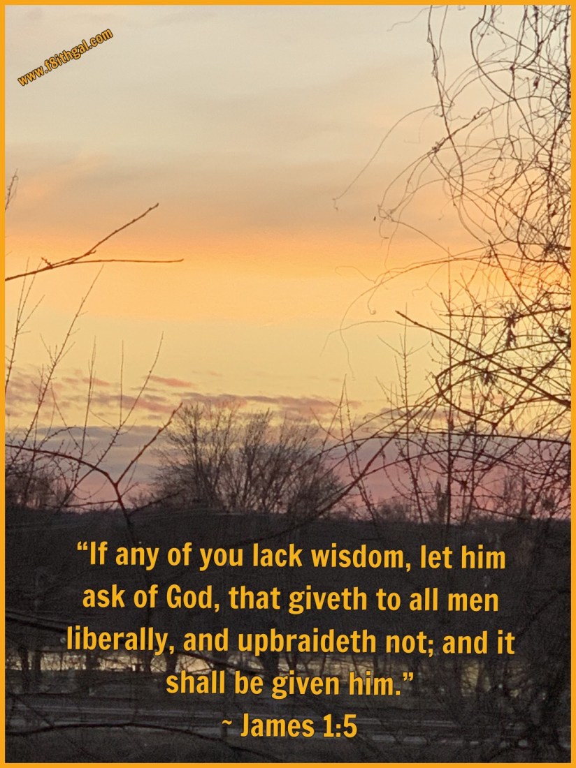 Every morning I pray for God to give me wisdom as I face my day. Not wisdom as the world may see it, but Godly wisdom. I smiled when I opened my Bible app this evening and saw James 1:5 as the verse of day, “If any of you lack wisdom, let him ask of God, that giveth to all [men] liberally, and upbraideth not; and it shall be given him.” There is no excuse to be lacking in wisdom. If you seek the Lord for it, He will open it up to you. It doesn’t require a college education or fine pedigree. No, it only requires a sincere heart when you ask your Father for it. His word says if you lack wisdom to ask Him for it “and it shall be given him.” How awesome is that?! π~ Chelle, #f8ithgal