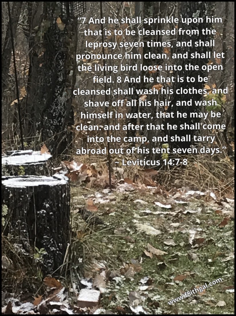 “7 And he shall sprinkle upon him that is to be cleansed from the leprosy seven times, and shall pronounce him clean, and shall let the living bird loose into the open field. 8 And he that is to be cleansed shall wash his clothes, and shave off all his hair, and wash himself in water, that he may be clean: and after that he shall come into the camp, and shall tarry abroad out of his tent seven days.” Leviticus 14:7-8