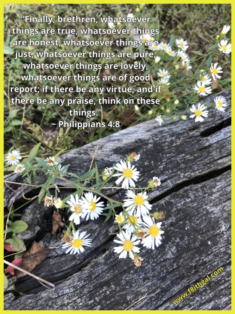 It’s not thinking too much that is bad, it’s thinking too much about things that steal my peace. It’s dwelling on those things that rob my joy. It’s that negative thinking that must change. The Bible tells us in Philippians 4:8 what to think on, “Finally, brethren, whatsoever things are true, whatsoever things are honest, whatsoever things are just, whatsoever things are pure, whatsoever things are lovely, whatsoever things are of good report; if there be any virtue, and if there be any praise, think on these things.” The Holy Spirit keeps bringing that verse into my spirit. I think one of my bite sized goals for February is going to be centered around Philippians 4:8. I’m going to make it a daily habit to think on “these things” in that Scripture and see what kind of impact it has on my thinking at the end of the month. I challenge you to give it a try as well. 💛 ~ Chelle, #f8ithgal