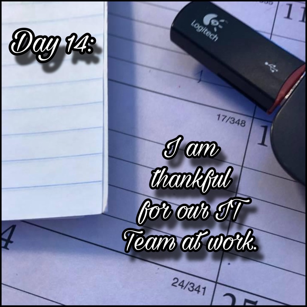 Day 14: I am thankful for our IT Team at work. This team is outstanding. I watched them set up our entire office when I was managing it in FL. They have set me up remotely in LA, CO, and WV. Yesterday I was having issues that was affecting my productivity, I sent a ticket and they responded immediately. I was fixed and today everything ran smoothly and so fast. I grateful to have such an awesome team that keeps things running! π¦ ~ Chelle, #f8ithgal