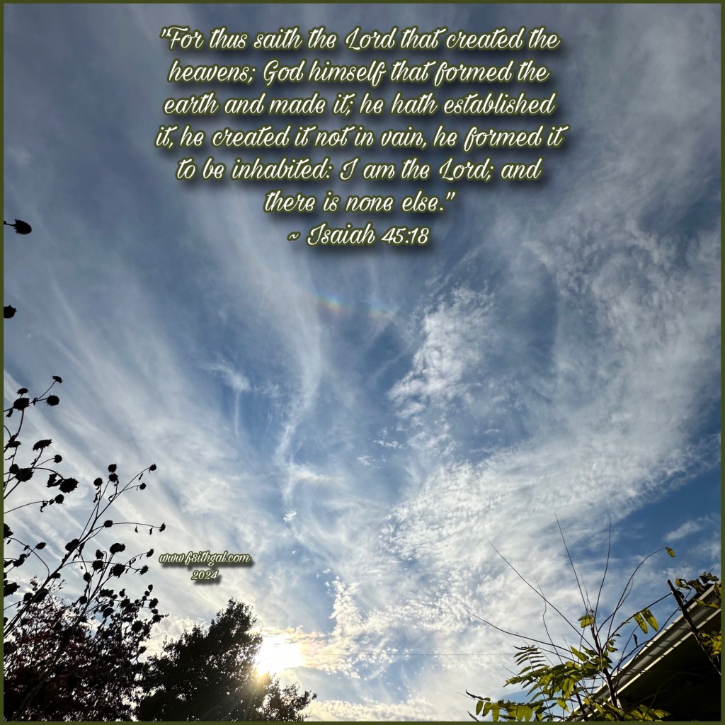 “For thus saith the Lord that created the heavens; God himself that formed the earth and made it; he hath established it, he created it not in vain, he formed it to be inhabited: I am the Lord; and there is none else. ~ Isaiah 45:18