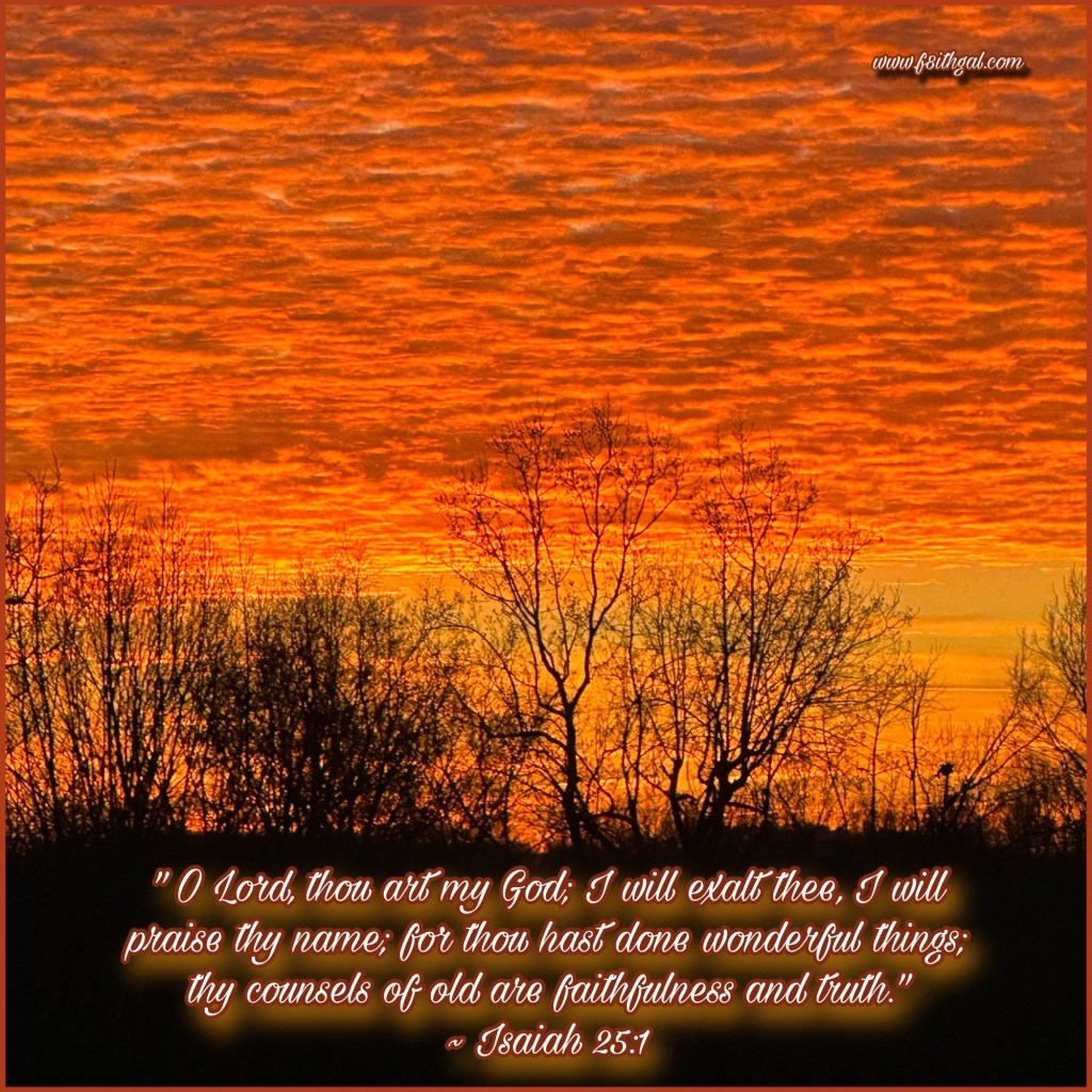 “ O Lord, thou art my God; I will exalt thee, I will praise thy name; for thou hast done wonderful things; thy counsels of old are faithfulness and truth.” – Isaiah 25:1