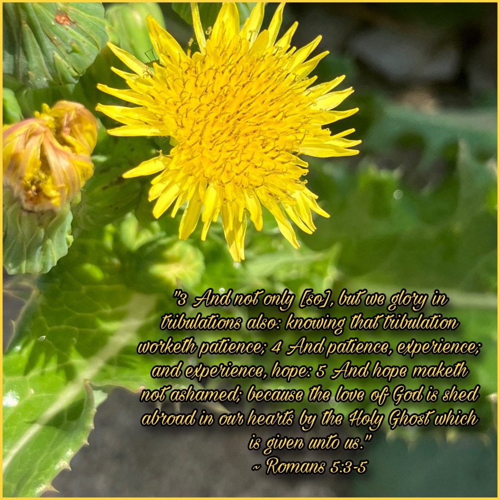 “3 And not only [so], but we glory in tribulations also: knowing that tribulation worketh patience; 4 And patience, experience; and experience, hope: 5 And hope maketh not ashamed; because the love of God is shed abroad in our hearts by the Holy Ghost which is given unto us.” ~ Roman’s 5:3-5