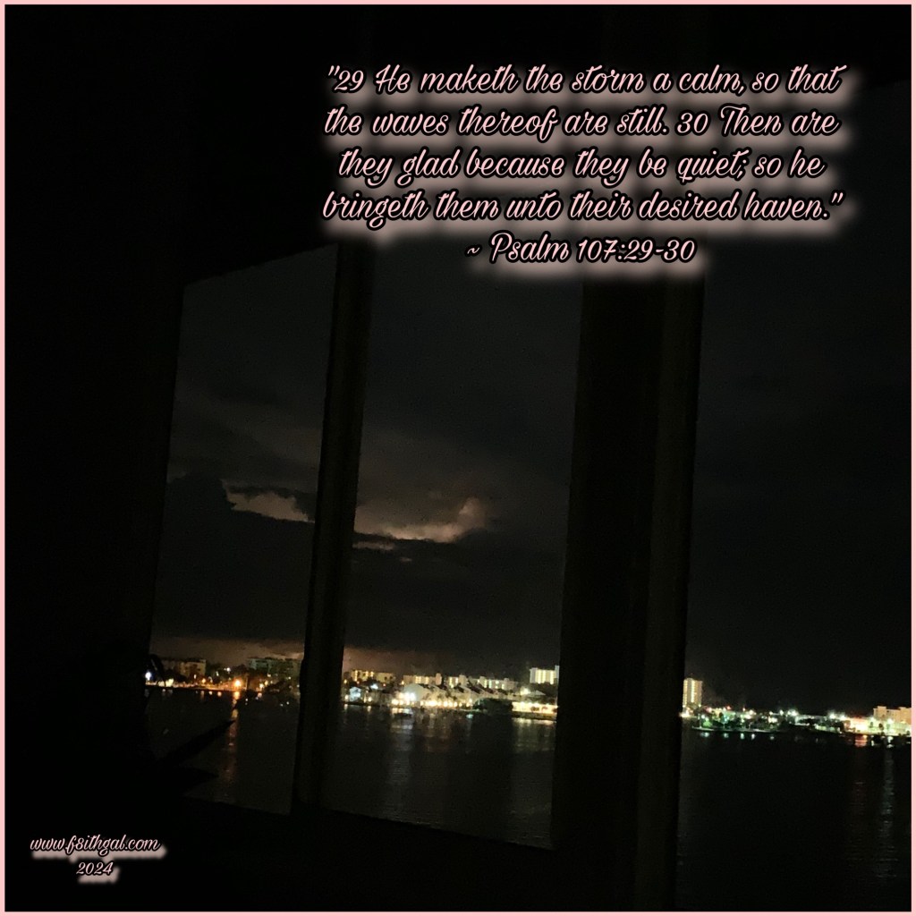 “29 He maketh the storm a calm, so that the waves thereof are still. 30 Then are they glad because they be quiet; so he bringeth them unto their desired haven.” ~ Psalm 107:29-30