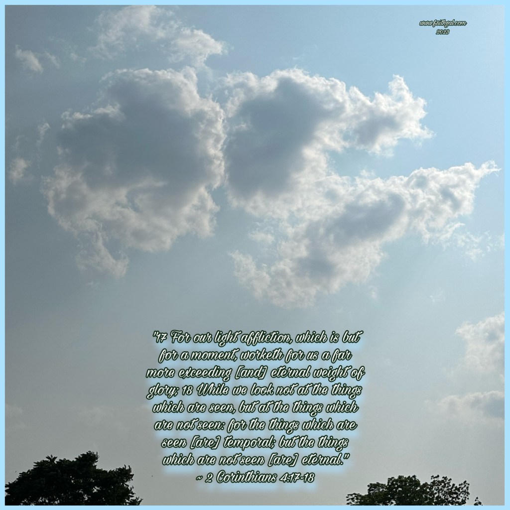 “17 For our light affliction, which is but for a moment, worketh for us a far more exceeding [and] eternal weight of glory; 18 While we look not at the things which are seen, but at the things which are not seen: for the things which are seen [are] temporal; but the things which are not seen [are] eternal.” ~ 2 Corinthians 4:17-18