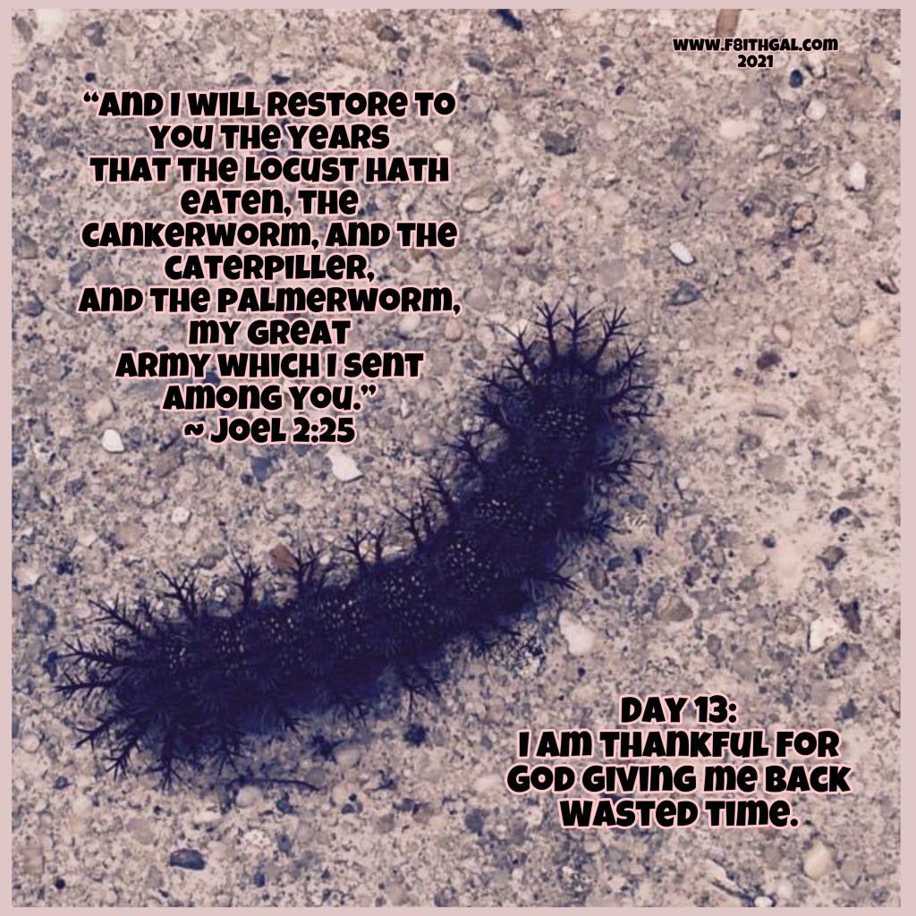 For day 13, I am thankful for God giving me back wasted time. The enemy loves to plant seeds of doubt. Those include, you are too old, you’ve wasted too many years. This morning in my prayer time with my Poppa I once again ask Him “what would you have me me thankful for today” and He told I am right where He wants me to be. The enemy blinds me with thoughts that I’ve wasted years, but He has mapped out my life and I’m right on His schedule! When I got online the first thing I saw was Joel 2:25, confirmation. Any wasted time from the ENEMY will be restored!!! Look at my God! I have a destiny to fulfill for the Kingdom of God and I’m right on HIS schedule! On HIS timing! Glory hallelujah, what an awesome God we serve. Silly devil, tries to bombard me with thoughts of wasted time that HE stole, that God will restore!!! I am so thankful for the time ONLY God can restore and the confirmation He gave me this morning. That is God! 💛 ~ Chelle, #f8ithgal