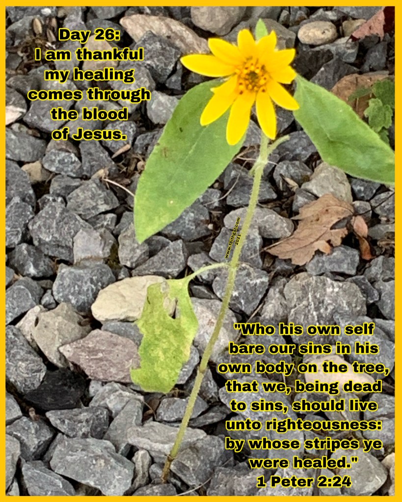 For day 26, I am thankful my healing comes through the blood of Jesus. It cancels out any bad report and sickness over me regardless of the manifestation that has yet to take place! 1 Peter 2:24 tells me by His stripes ye were healed, that is past tense meaning that healing has already taken place. I claim that healing in the name of Jesus and I thank Him for it. 💛 ~ Chelle, #f8ithgal
