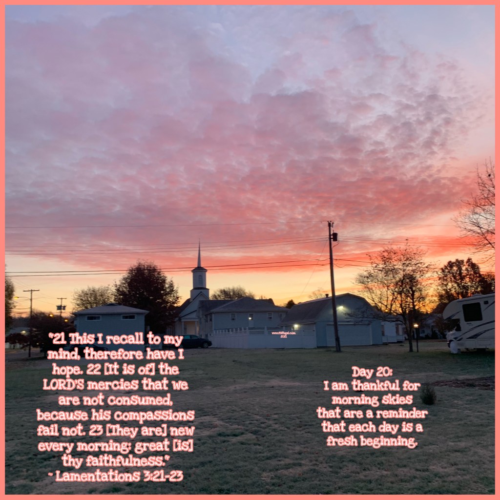 For day 20, I am thankful for morning skies that are a reminder that each day is a fresh beginning. As I was looking for a verse for my thankful picture today, my Poppa brought me to Lamentations 3:21-23 and of course it was just perfect! The Lord’s mercies are never consumed because He is so full of compassion for us and He has so much patience with this daughter! They are new every morning and His beautiful hand painted sky reminded me of this morning. He is so full of love for me and so faithful even when I start to fill with worry and fear, things that should not be there! I’m thankful for His forgiveness and morning skies that remind me today is a fresh beginning and His grace has me covered through the blood of Jesus. 💛 ~ Chelle, #f8ithgal