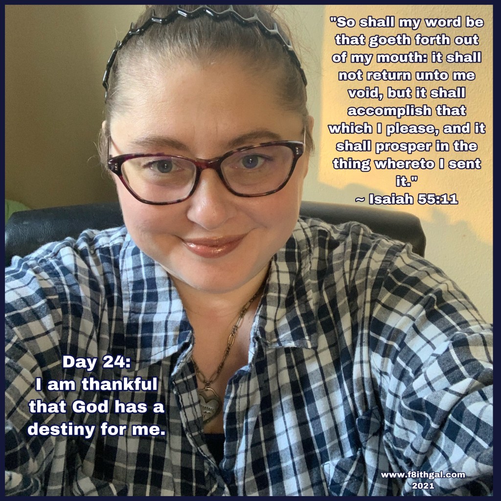 For day 24, I am thankful that God has a destiny for me. God has been speaking to me a lot about that destiny lately while the enemy has been trying to plant seeds of doubt. I’m thankful for a Father who confirms and reaffirms with His Word and through others to reassure me that it will come to pass and it is His timing, I am not late! 💛 ~ Chelle, #f8uthgal