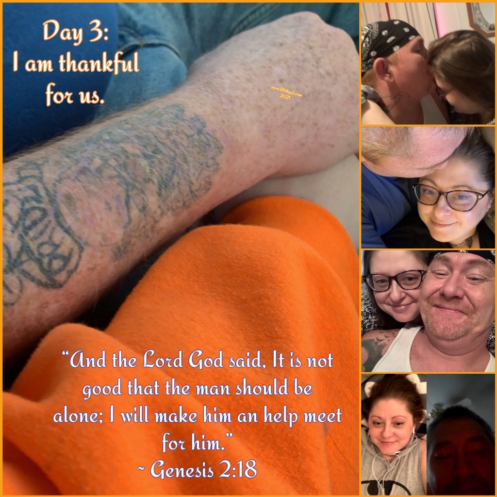For day 3, I am thankful for us. I have been through a couple of really mentally abusive relationships. They changed everything about me, especially the way my mind processes things. Recovering from those is a challenge not only for me, but for the man that God has blessed me with. He has been so very patient with me and loves me on those days I find it difficult to love myself. He believes in me and the dreams God has placed in my heart and I believe in him! God brought us together for a reason and I am so very thankful. 💛 ~ Chelle, #f8ithgal