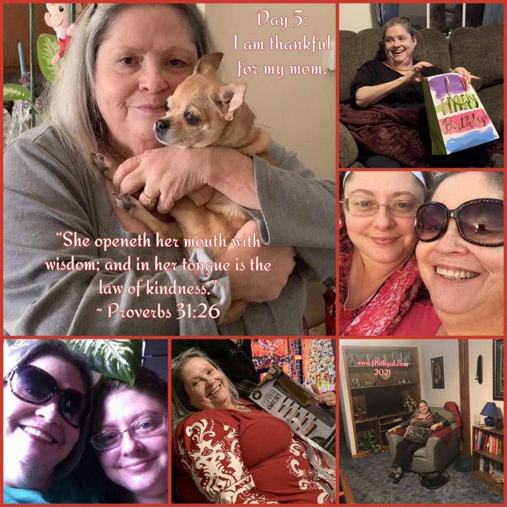 For day 5, I am thankful for my mom. She has stood beside me through so much, sharing both Godly wisdom and wisdom she has gleaned from this life. I am very blessed to still have her and the wealth of knowledge she has to impart into me. She instilled a strong work ethic within me and solid CHRISTian foundation to build my life on. I am so thankful for my mom. 💛 ~ Chelle, #f8ithgal