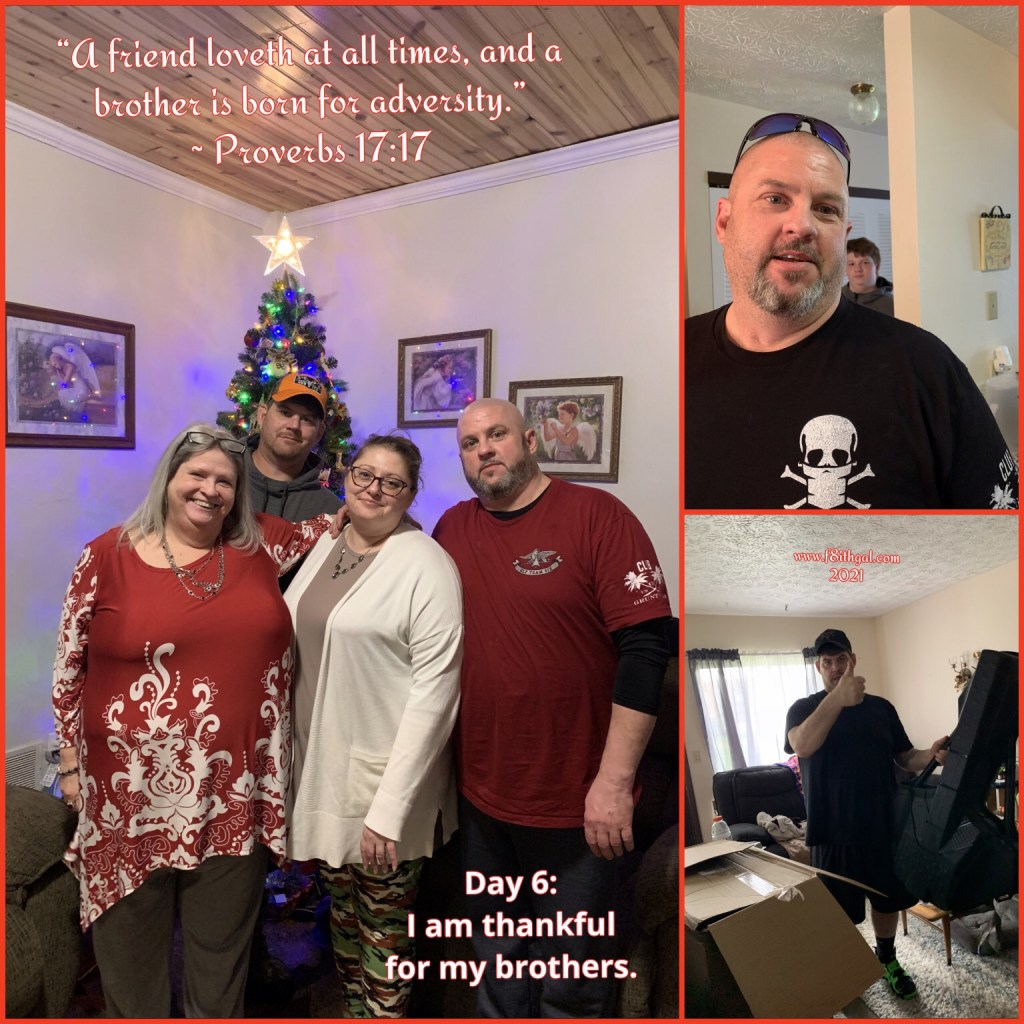 For day 6, I am thankful for my brothers. My life has had some pretty crazy twist and turns. Some of my life choices have been disastrous, but these two have always had my back regardless! So many times I have called them crying, just needing someone to listen. It doesn’t matter what I need, they are there and I am so very thankful. 💛 ~ Chelle, #f8ithgal