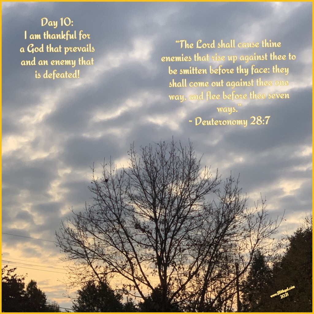 For day 10, I am thankful for a God that prevails and an enemy that is defeated! The enemy has flooded me with one attack after another this week. As the dose of steroids came down the pain in my mouth returned and it was literally one attack after another in addition to it. It hurts to even talk or swallow. By this evening, I was just weary. Sitting on my bed near tears, my heart was encouraged by a precious sister’s response to my blog. I sat here and began to contemplate about my thankful post for today, my heart was about half thinking and half talking to my Poppa. The Holy Spirit brought to my memory, the enemy will flee 7 ways before you. I began to look for the verse and sure enough there it was in Deuteronomy 28:7! The Lord had already told me the attack on my mouth was a personal and concise one. It is to be used as a mouthpiece for HIM and the devil is trying to stop it, but he will not prevail. This will be a testing of my faith, but it will be healed and the Word of the Lord will pour forth from His daughter. I am excited and thankful for a God that prevails and an enemy that is defeated!!! 💛 ~ Chelle, #f8ithgal
