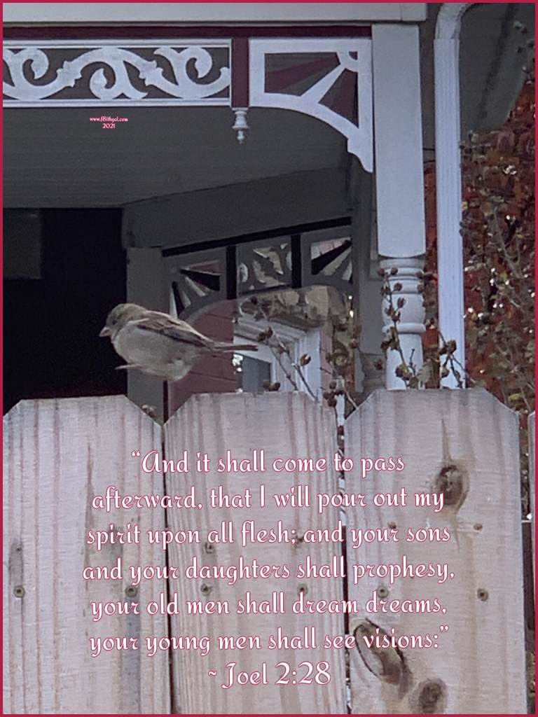 “And it shall come to pass afterward, that I will pour out my spirit upon all flesh; and your sons and your daughters shall prophesy, your old men shall dream dreams, your young men shall see visions:” ~ Joel 2:28