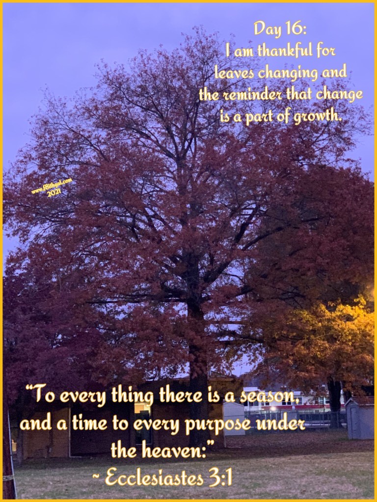 For day 16, I am thankful for leaves changing and the reminder that change is a part of growth. In the mornings I take April out and watch the sky and talk to my Poppa. It’s my #protectingmypeace time. This morning my Poppa brought the leaves on the trees to my attention. They are beautiful as they are changing their colors. I noticed others had already started to loose their leaves and were standing almost bare. I am a person who likes consistency and really doesn’t like change at all, but my Father reminded me that change is a part of growth. If I am not changing, I am stagnant. I can’t grow into my destiny and remain where I am. Whew, what a word from God! This morning, I am so thankful for those beautiful leaves that change every year! 💛 ~ Chelle, #f8ithgal