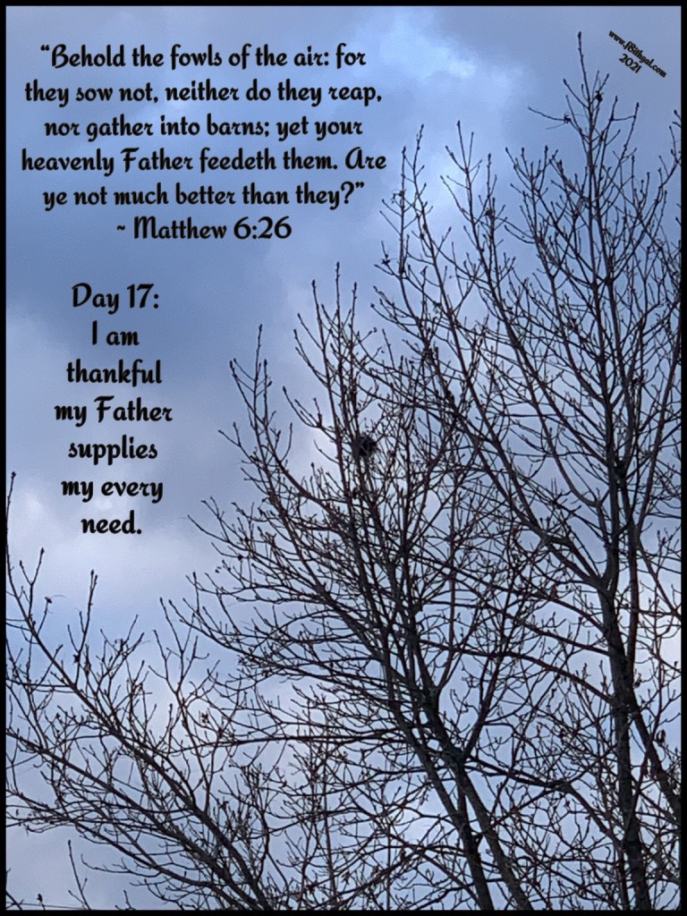 Day 17, I am thankful my Father supplies my every need. I went out this morning to steal a little #protectingmypeace time before work and the Lord drew my attention to a bird’s nest in a tree that had already lost all of its leaves. I was amazed it was standing out so clearly among the bare branches. I felt the Lord telling me, He cares for the small birds and me too. I could feel His presence as I watched the tree in amazement. We’ve had really strong winds and that nest was not moved, how much more do I care for you daughter. I began to ponder on Matthew 6:26. He loves us enough to even number the hairs on our head y’all! There is not a need that we have, that our Father can not provide for. Do you have the faith to trust him to see it through? Mine is growing every single day and I’m thankful for a Father who is big enough to supply my every need! 💛 ~ Chelle, #f8ithgal
