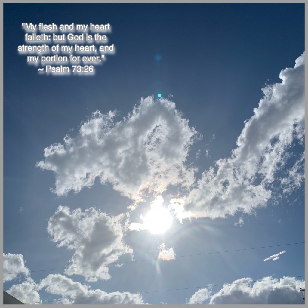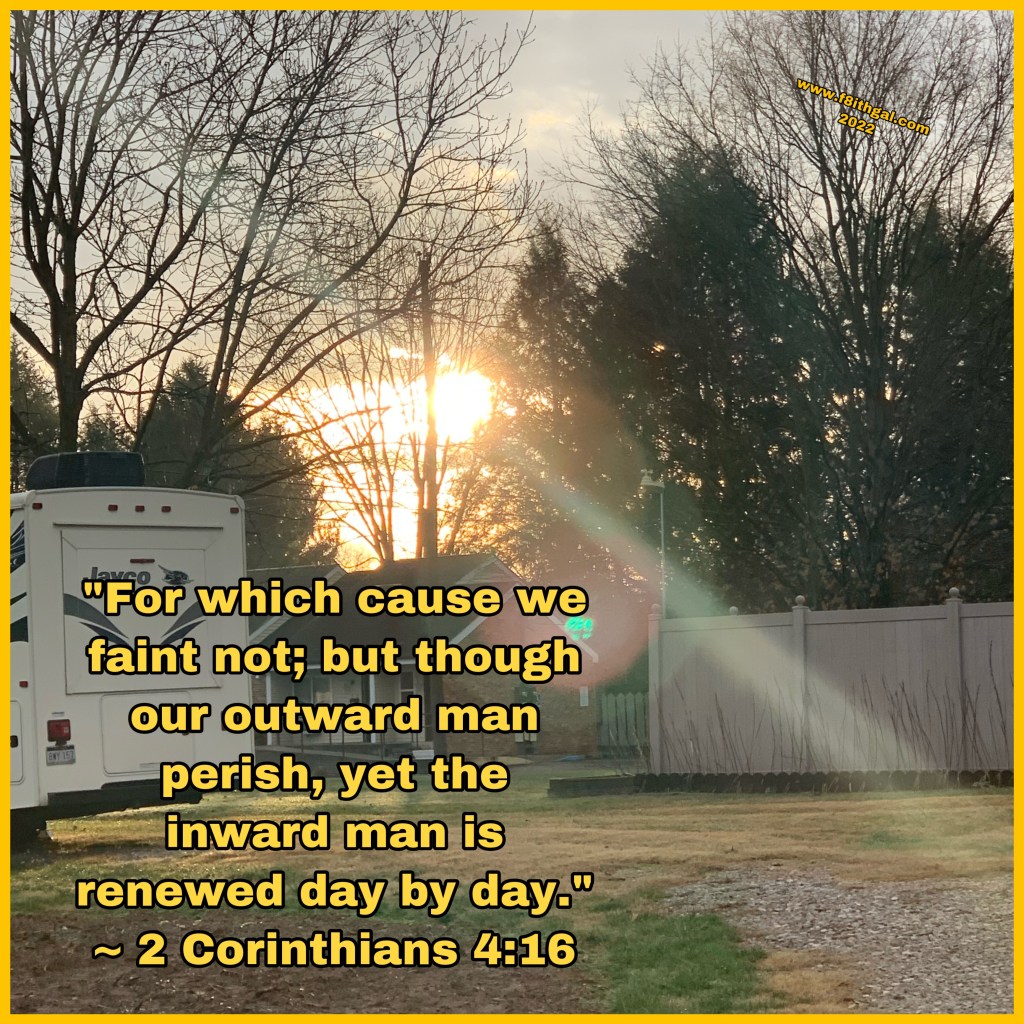“16 For which cause we faint not; but though our outward man perish, yet the inward [man] is renewed day by day. 17 For our light affliction, which is but for a moment, worketh for us a far more exceeding [and] eternal weight of glory; 18 While we look not at the things which are seen, but at the things which are not seen: for the things which are seen [are] temporal; but the things which are not seen [are] eternal.” ~ 2 Corinthians 4:16-18