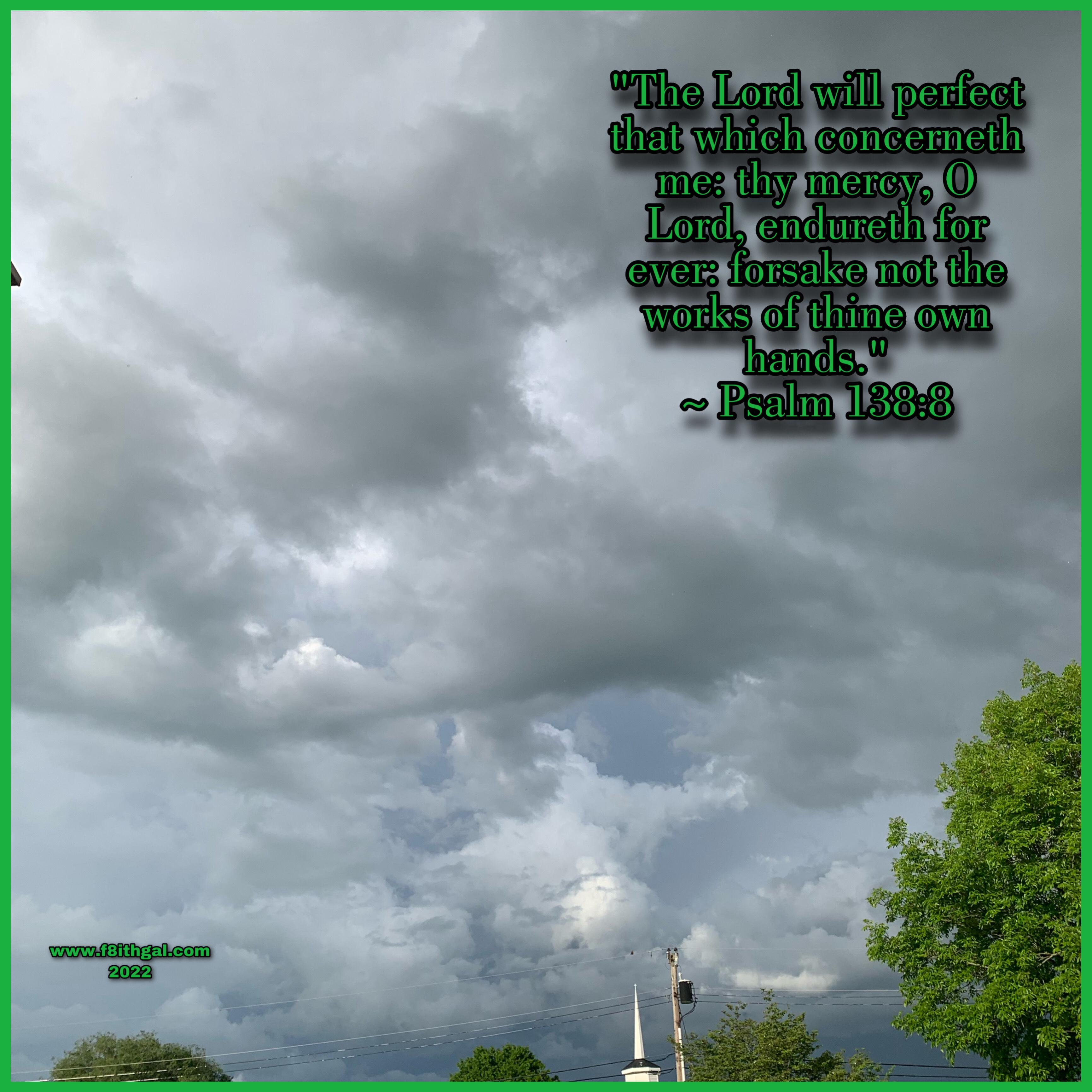 For day 18, I am thankful for the storm clouds and the rain. I went out this morning and watched the fast moving clouds, we are supposed to get rain today. I love the rain, everything smells so fresh and new afterwards. I started to reflect on the storms throughout my life. No one likes severe storms, they can be scary. Power outages, flooding, messes to clean up; but, in life those storms clear way messes and debris that are holding you back. While it is not pleasant, it is necessary. I don’t enjoy the storms while I’m in them, but I’m learning to find peace through my Father and finding His grace is indeed sufficient for me and my strength is made perfect in weakness. Therefore, I am thankful for those storm clouds and the rains. 💛 ~ Chelle, #f8ithgal