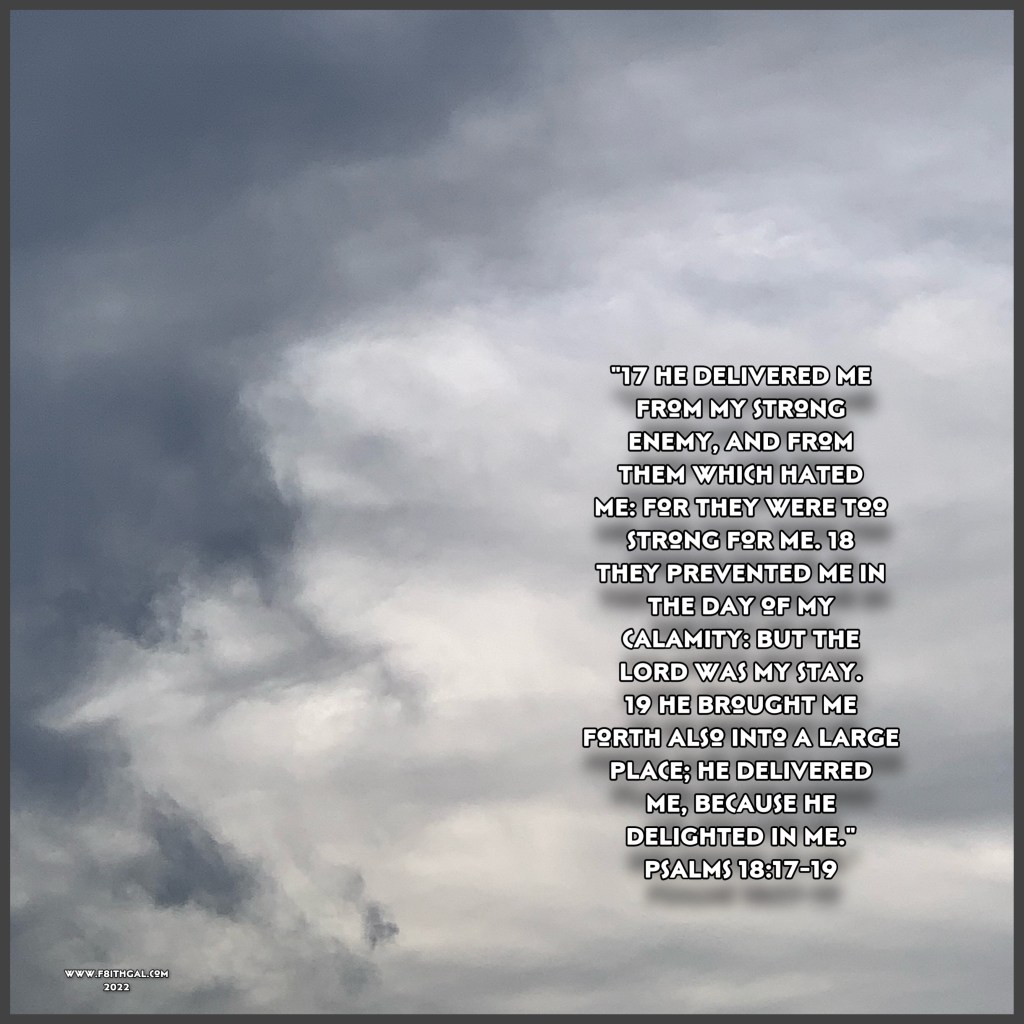 “17 He delivered me from my strong enemy, and from them which hated me: for they were too strong for me. 18 They prevented me in the day of my calamity: but the LORD was my stay. 19 He brought me forth also into a large place; he delivered me, because he delighted in me.” ~ Psalms 18:17-19