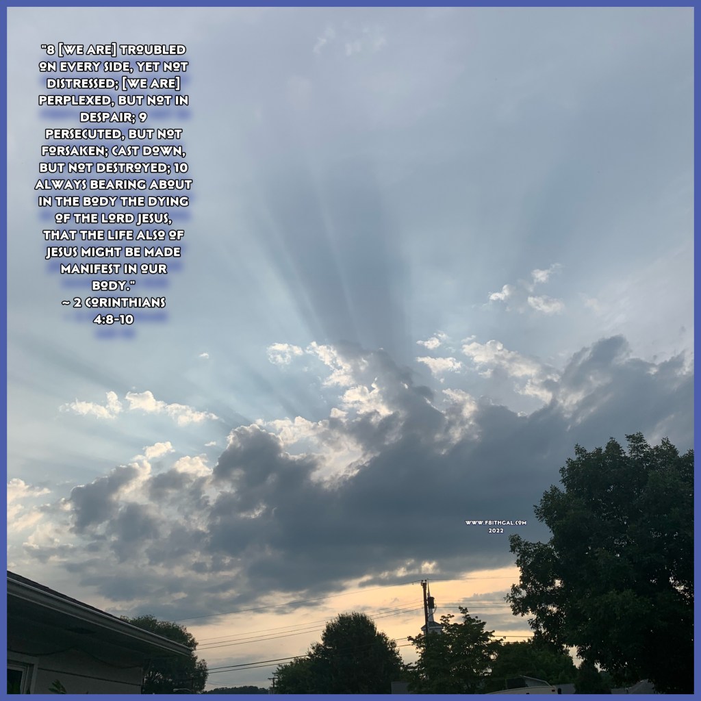 “8 [We are] troubled on every side, yet not distressed; [we are] perplexed, but not in despair; 9 Persecuted, but not forsaken; cast down, but not destroyed; 10 Always bearing about in the body the dying of the Lord Jesus, that the life also of Jesus might be made manifest in our body.”~ 2 Corinthians 4:8-10