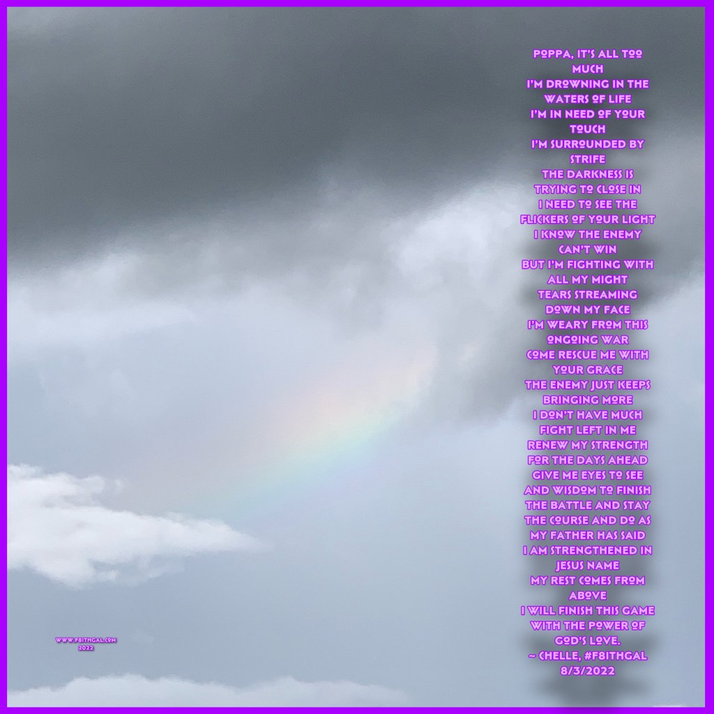 Poppa, it’s all too much I’m drowning in the waters of life I’m in need of your touch I’m surrounded by strife The darkness is trying to close in I need to see the flickers of Your light I know the enemy can’t win But I’m fighting with all my might Tears streaming down my face I’m weary from this ongoing war Come rescue me with your grace The enemy just keeps bringing more I don’t have much fight left in me Renew my strength for the days ahead Give me eyes to see And wisdom to finish the battle and stay the course and do as my Father has said I am strengthened in Jesus name My rest comes from above I will finish this game With the power of God’s love. ~ Chelle, #f8ithgal 8/3/2022