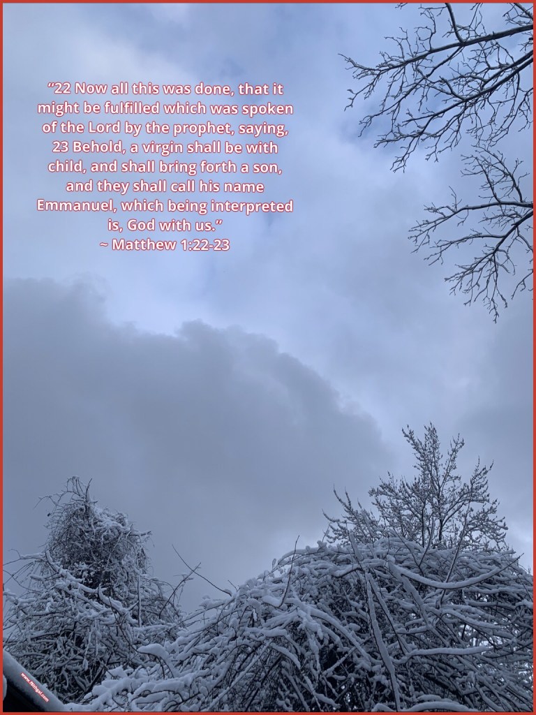 “22 Now all this was done, that it might be fulfilled which was spoken of the Lord by the prophet, saying, 23 Behold, a virgin shall be with child, and shall bring forth a son, and they shall call his name Emmanuel, which being interpreted is, God with us.” ~Matthew 1:22-23