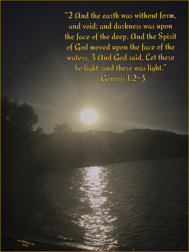 “2 And the earth was without form, and void; and darkness [was] upon the face of the deep. And the Spirit of God moved upon the face of the waters. 3 And God said, Let there be light: and there was light.” ~ Genesis 1:2-3