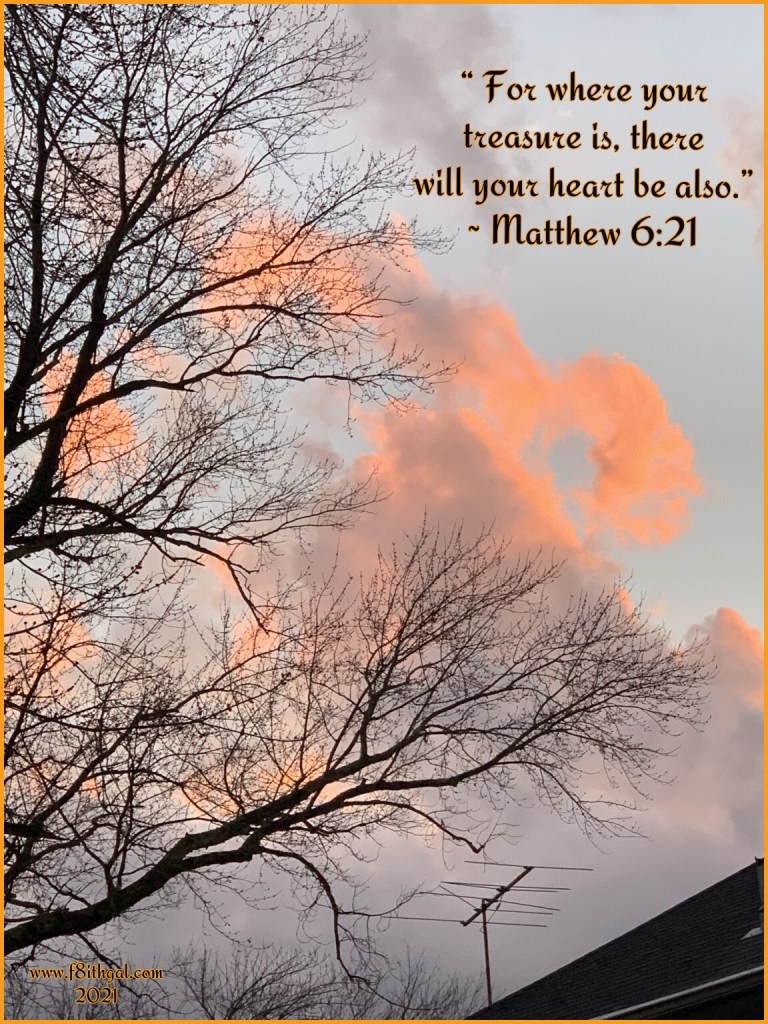 He tells me so often, daughter why do you worry so?! Verses 22-31 tells us God knows of the things we need before we even ask. The ravens don’t worry about what to eat, the lilies are beautifully clothed, and neither should we! Life is more than meat and what to wear, our focus should not be worrying on these things. Seek God and these things will be added! Verse 34 says a lot, “For where your treasure is there will your heart be also?” I can’t say enough how important those heart checks are! I’ll end with verse 40, “Be ye therefore ready also: for the Son of man cometh at an hour when ye think not.” You never know when Jesus is coming back. You also never know when you will take your last breath. Are you ready? ~ Chelle, #f8ithgal