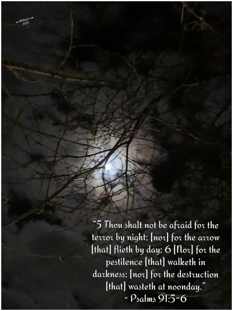 “5 Thou shalt not be afraid for the terror by night; [nor] for the arrow [that] flieth by day; 6 [Nor] for the pestilence [that] walketh in darkness; [nor] for the destruction [that] wasteth at noonday.” ~ Psalms 91:5-6