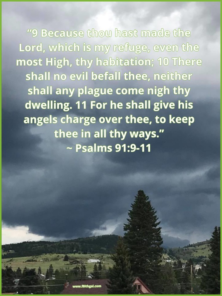 “9 Because thou hast made the LORD, [which is] my refuge, [even] the most High, thy habitation; 10 There shall no evil befall thee, neither shall any plague come nigh thy dwelling. 11 For he shall give his angels charge over thee, to keep thee in all thy ways.” ~ Psalms 91:9-11