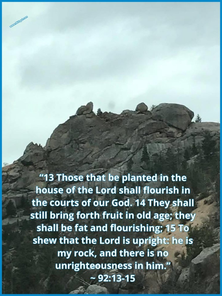 “13 Those that be planted in the house of the Lordshall flourish in the courts of our God. 14 They shall still bring forth fruit in old age; they shall be fat and flourishing; 15 To shew that the Lord is upright: he is my rock, and there is no unrighteousness in him.” ~ Psalms 92:13-15