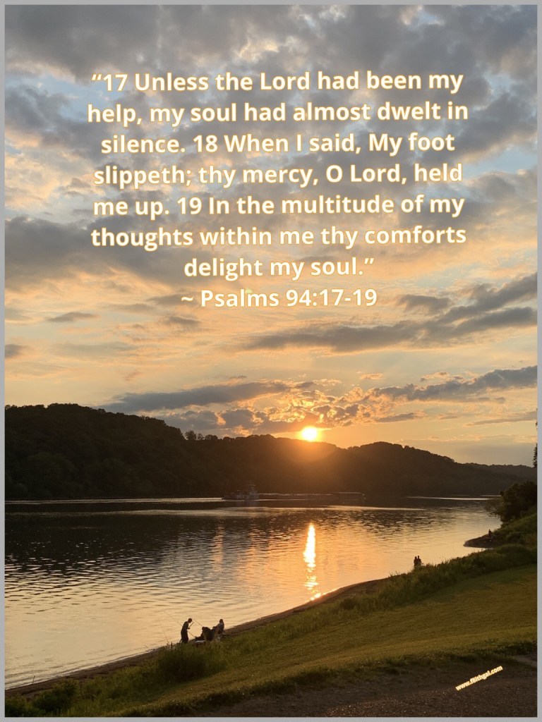 “17 Unless the LORD [had been] my help, my soul had almost dwelt in silence. 18 When I said, My foot slippeth; thy mercy, O LORD, held me up. 19 In the multitude of my thoughts within me thy comforts delight my soul.” ~ Psalms 94:17-19