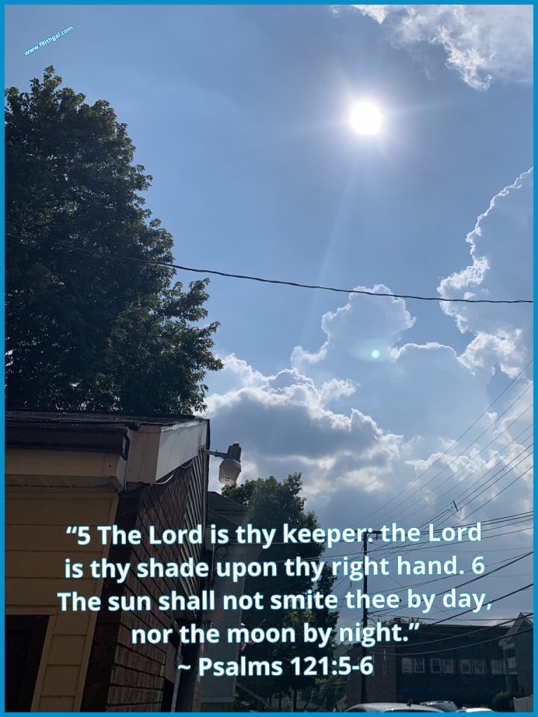 “5 The LORD [is] thy keeper: the LORD [is] thy shade upon thy right hand. 6 The sun shall not smite thee by day, nor the moon by night.” ~ Psalms 121:5-6
