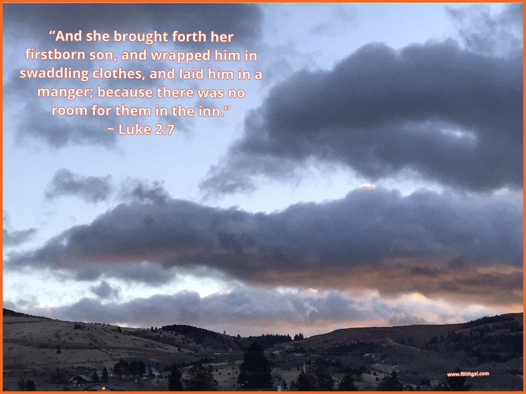 “1 And it came to pass in those days, that there went out a decree from Caesar Augustus, that all the world should be taxed. 2 ([And] this taxing was first made when Cyrenius was governor of Syria.) 3 And all went to be taxed, every one into his own city. 4 And Joseph also went up from Galilee, out of the city of Nazareth, into Judaea, unto the city of David, which is called Bethlehem; (because he was of the house and lineage of David:) 5 To be taxed with Mary his espoused wife, being great with child. 6 And so it was, that, while they were there, the days were accomplished that she should be delivered. 7 And she brought forth her firstborn son, and wrapped him in swaddling clothes, and laid him in a manger; because there was no room for them in the inn. 8 And there were in the same country shepherds abiding in the field, keeping watch over their flock by night. 9 And, lo, the angel of the Lord came upon them, and the glory of the Lord shone round about them: and they were sore afraid. 10 And the angel said unto them, Fear not: for, behold, I bring you good tidings of great joy, which shall be to all people. 11 For unto you is born this day in the city of David a Saviour, which is Christ the Lord. 12 And this [shall be] a sign unto you; Ye shall find the babe wrapped in swaddling clothes, lying in a manger. 13 And suddenly there was with the angel a multitude of the heavenly host praising God, and saying, 14 Glory to God in the highest, and on earth peace, good will toward men. 15 And it came to pass, as the angels were gone away from them into heaven, the shepherds said one to another, Let us now go even unto Bethlehem, and see this thing which is come to pass, which the Lord hath made known unto us. 16 And they came with haste, and found Mary, and Joseph, and the babe lying in a manger. 17 And when they had seen [it], they made known abroad the saying which was told them concerning this child. 18 And all they that heard [it] wondered at those things which were told them by the shepherds. 19 But Mary kept all these things, and pondered [them] in her heart. 20 And the shepherds returned, glorifying and praising God for all the things that they had heard and seen, as it was told unto them. 21 And when eight days were accomplished for the circumcising of the child, his name was called JESUS, which was so named of the angel before he was conceived in the womb. 22 And when the days of her purification according to the law of Moses were accomplished, they brought him to Jerusalem, to present [him] to the Lord; 23 (As it is written in the law of the Lord, Every male that openeth the womb shall be called holy to the Lord;) 24 And to offer a sacrifice according to that which is said in the law of the Lord, A pair of turtledoves, or two young pigeons. 25 And, behold, there was a man in Jerusalem, whose name [was] Simeon; and the same man [was] just and devout, waiting for the consolation of Israel: and the Holy Ghost was upon him. 26 And it was revealed unto him by the Holy Ghost, that he should not see death, before he had seen the Lord’s Christ. 27 And he came by the Spirit into the temple: and when the parents brought in the child Jesus, to do for him after the custom of the law, 28 Then took he him up in his arms, and blessed God, and said, 29 Lord, now lettest thou thy servant depart in peace, according to thy word: 30 For mine eyes have seen thy salvation, 31 Which thou hast prepared before the face of all people; 32 A light to lighten the Gentiles, and the glory of thy people Israel. 33 And Joseph and his mother marvelled at those things which were spoken of him. 34 And Simeon blessed them, and said unto Mary his mother, Behold, this [child] is set for the fall and rising again of many in Israel; and for a sign which shall be spoken against; 35 (Yea, a sword shall pierce through thy own soul also,) that the thoughts of many hearts may be revealed. 36 And there was one Anna, a prophetess, the daughter of Phanuel, of the tribe of Aser: she was of a great age, and had lived with an husband seven years from her virginity; 37 And she [was] a widow of about fourscore and four years, which departed not from the temple, but served [God] with fastings and prayers night and day. 38 And she coming in that instant gave thanks likewise unto the Lord, and spake of him to all them that looked for redemption in Jerusalem. 39 And when they had performed all things according to the law of the Lord, they returned into Galilee, to their own city Nazareth. 40 And the child grew, and waxed strong in spirit, filled with wisdom: and the grace of God was upon him. 41 Now his parents went to Jerusalem every year at the feast of the passover. 42 And when he was twelve years old, they went up to Jerusalem after the custom of the feast. 43 And when they had fulfilled the days, as they returned, the child Jesus tarried behind in Jerusalem; and Joseph and his mother knew not [of it]. 44 But they, supposing him to have been in the company, went a day’s journey; and they sought him among [their] kinsfolk and acquaintance. 45 And when they found him not, they turned back again to Jerusalem, seeking him. 46 And it came to pass, that after three days they found him in the temple, sitting in the midst of the doctors, both hearing them, and asking them questions. 47 And all that heard him were astonished at his understanding and answers. 48 And when they saw him, they were amazed: and his mother said unto him, Son, why hast thou thus dealt with us? behold, thy father and I have sought thee sorrowing. 49 And he said unto them, How is it that ye sought me? wist ye not that I must be about my Father’s business? 50 And they understood not the saying which he spake unto them. 51 And he went down with them, and came to Nazareth, and was subject unto them: but his mother kept all these sayings in her heart. 52 And Jesus increased in wisdom and stature, and in favour with God and man.” ~ Luke 2:1-52