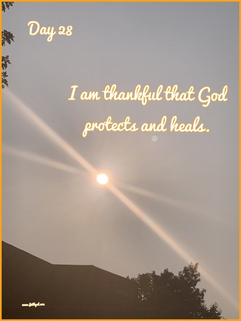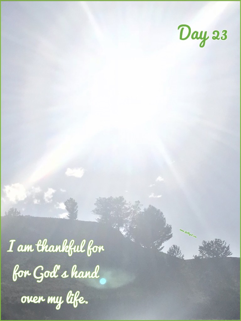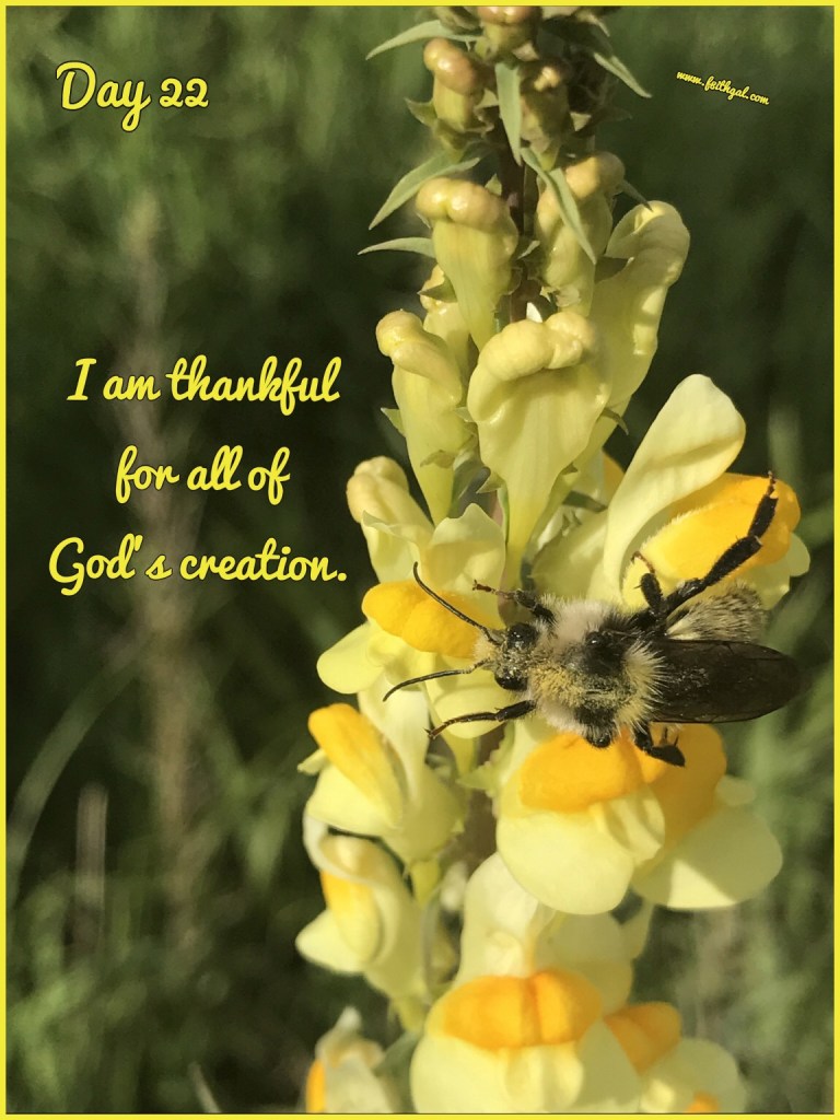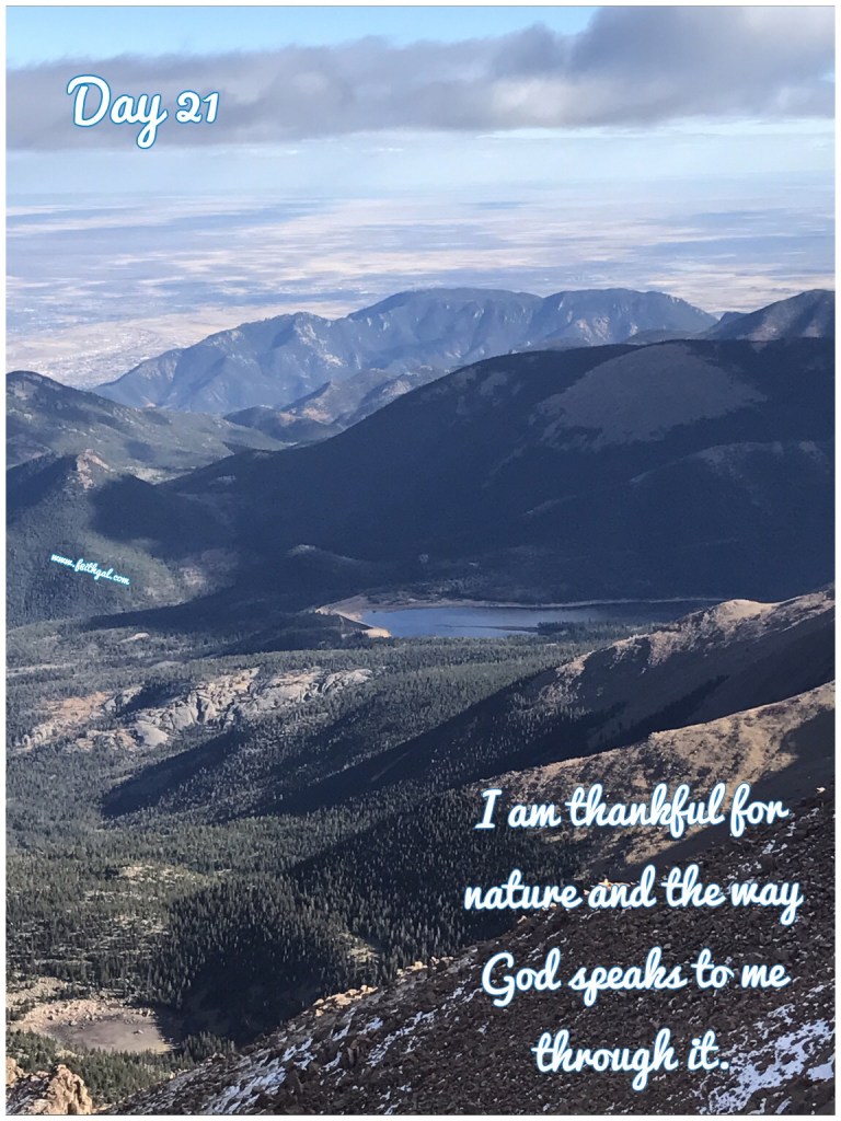 A little late for day 21, but I am so thankful for nature. God has blessed us with beautiful mountains and oceans. There are rivers and lakes. Vast woods and plains. Not to mention the breath taking sunsets and sunrises that He paints for us. So many times He speaks to me through those clouds I’m watching or those flowers I see blowing in the wind. It is just awesome how He can speak to us through His creation like that and I’m thankful that I can hear His voice in that way. 💛 ~ Chelle, #f8ithgal