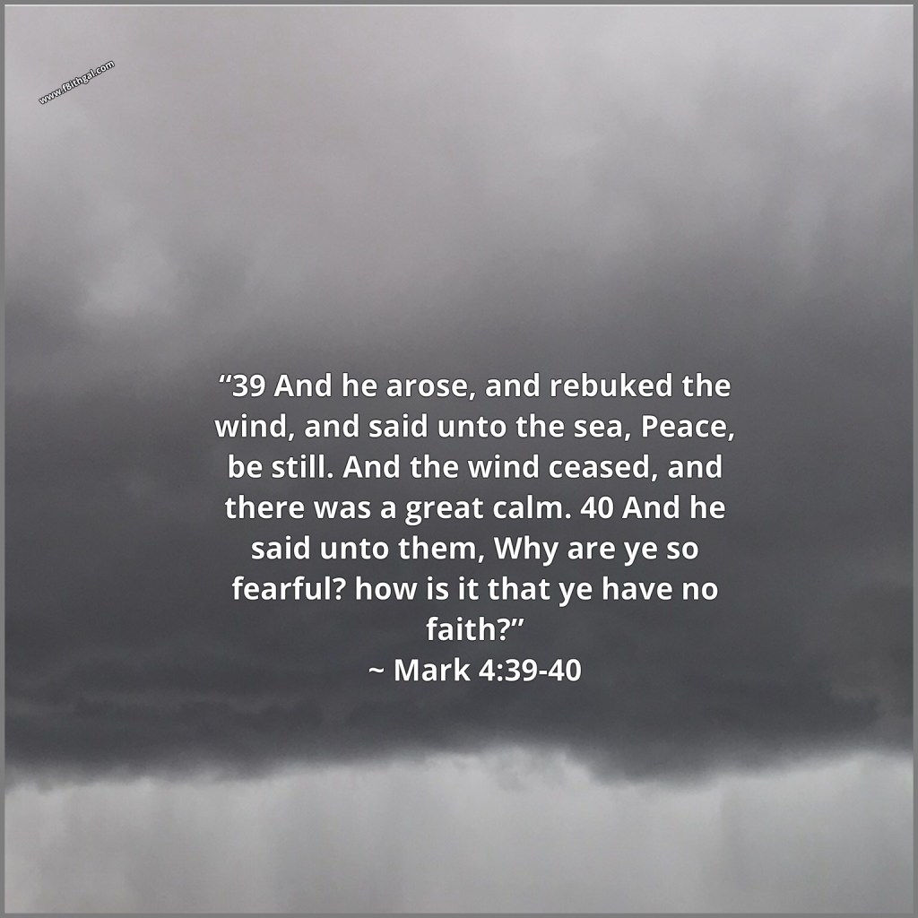 “{39} And he arose, and rebuked the wind, and said unto the sea, Peace, be still. And the wind ceased, and there was a great calm. {40} And he said unto them, Why are ye so fearful? how is it that ye have no faith?” ~ Mark 4:39-40