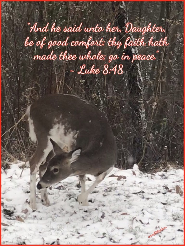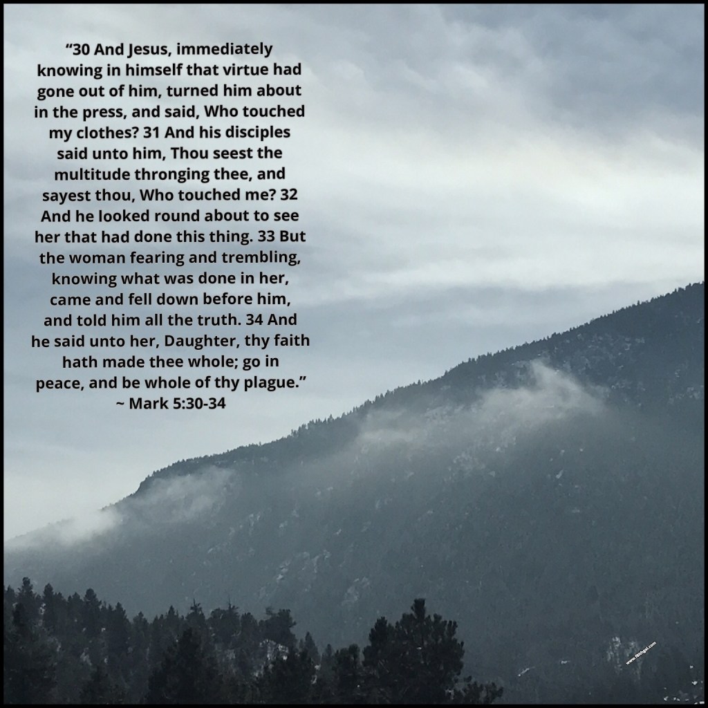 “{30} And Jesus, immediately knowing in himself that virtue had gone out of him, turned him about in the press, and said, Who touched my clothes? {31} And his disciples said unto him, Thou seest the multitude thronging thee, and sayest thou, Who touched me? {32} And he looked round about to see her that had done this thing. {33} But the woman fearing and trembling, knowing what was done in her, came and fell down before him, and told him all the truth. {34} And he said unto her, Daughter, thy faith hath made thee whole; go in peace, and be whole of thy plague.” ~ Mark 5:30-34