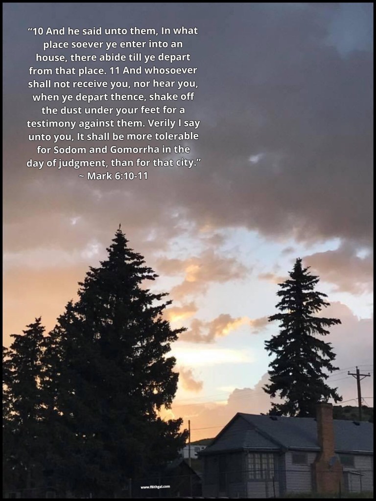 “{10} And he said unto them, In what place soever ye enter into an house, there abide till ye depart from that place. {11} And whosoever shall not receive you, nor hear you, when ye depart thence, shake off the dust under your feet for a testimony against them. Verily I say unto you, It shall be more tolerable for Sodom and Gomorrha in the day of judgment, than for that city.” ~ Mark 6:10-11