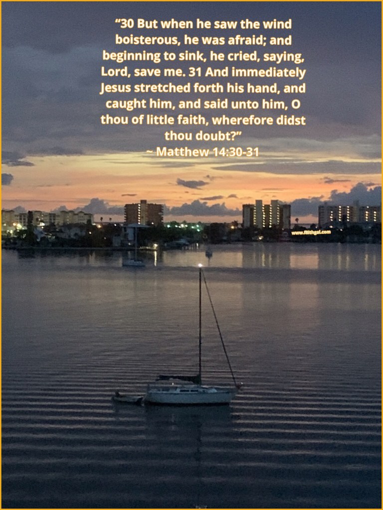 “30 But when he saw the wind boisterous, he was afraid; and beginning to sink, he cried, saying, Lord, save me. 31 And immediately Jesus stretched forth [his] hand, and caught him, and said unto him, O thou of little faith, wherefore didst thou doubt?” ~ Matthew 14:30-31