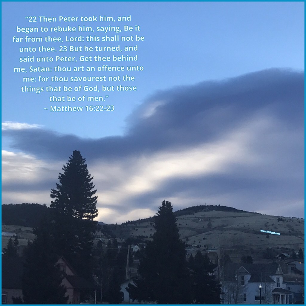 “22 Then Peter took him, and began to rebuke him, saying, Be it far from thee, Lord: this shall not be unto thee. 23 But he turned, and said unto Peter, Get thee behind me, Satan: thou art an offence unto me: for thou savourest not the things that be of God, but those that be of men.” ~ Matthew 16:22-23
